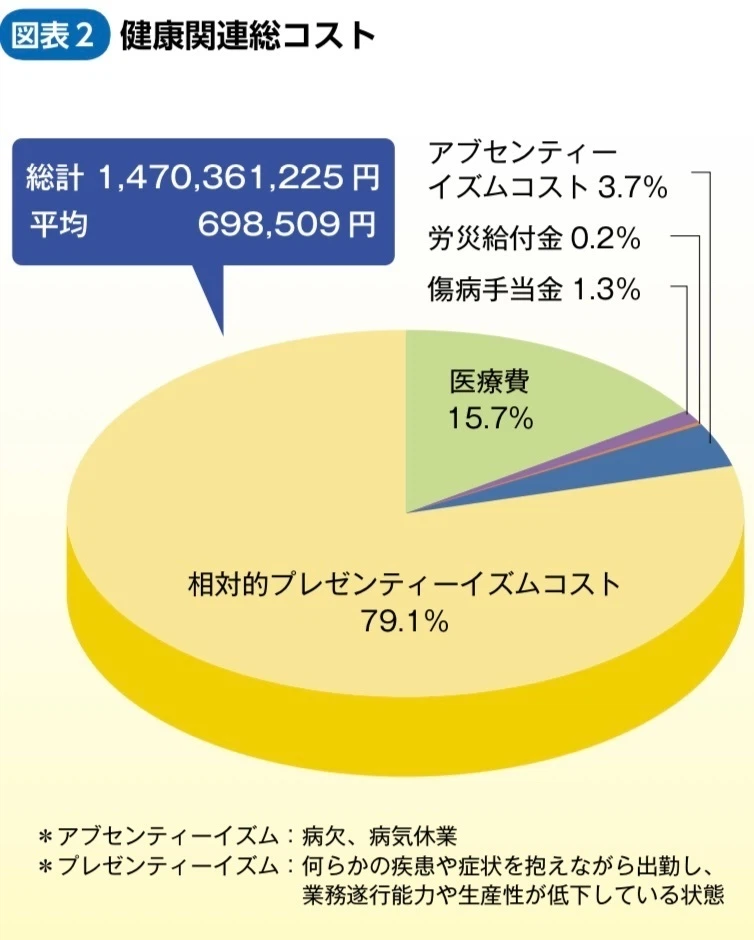 また先行研究によれば、従業員の健康に関連する総コストのうち、医療費に対してかかるコストは4分の1を占めるに過ぎず、プレゼンティーイズムによる生産性の損失が4分の3を占め、プレゼンティーイズムが健康に関するコストの核となっていることも近年の研究結果で導き出されています。